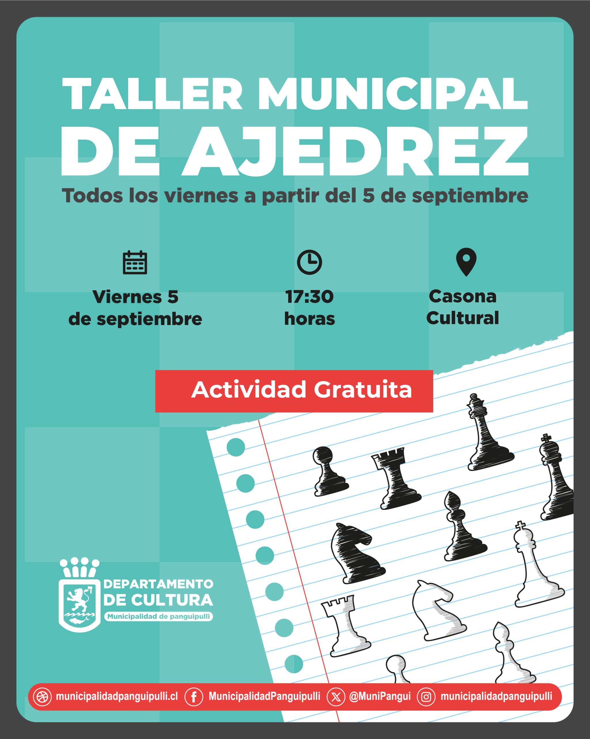 El taller comenzará este viernes 5 de septiembre y se impartirá todos los viernes a las 17:30 horas en la Casona Cultural. Una oportunidad ideal para desarrollar la concentración, la estrategia y el pensamiento crítico en un ambiente comunitario.