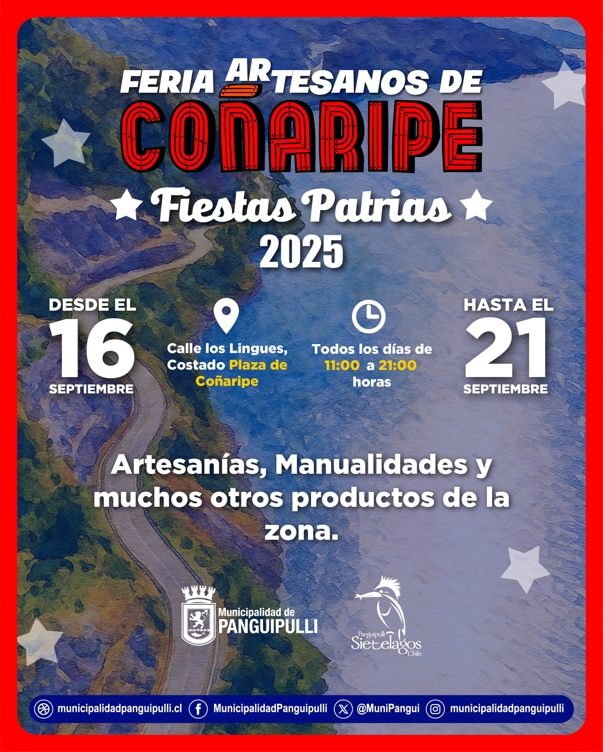 Con motivo de las celebraciones de Fiestas Patrias, desde el 16 al 21 de septiembre se realizará una nueva versión de la Feria de Artesanos de Coñaripe.