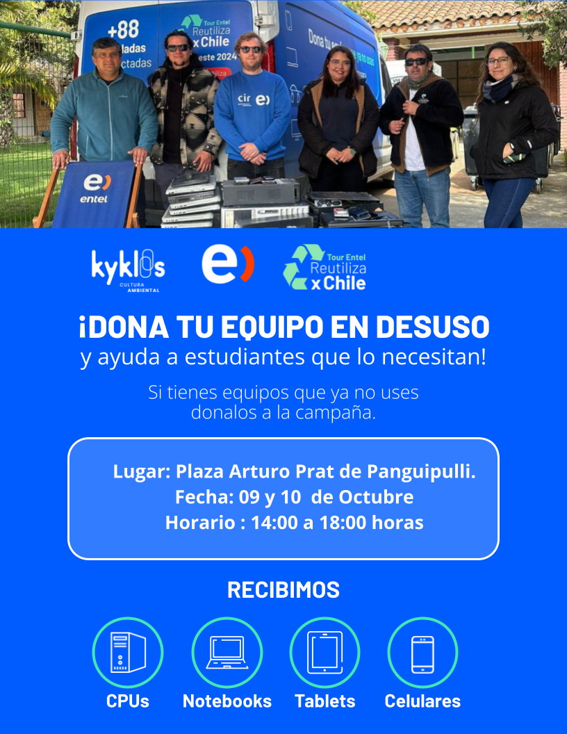 La Municipalidad de Panguipulli invita a toda la comunidad a sumarse a la campaña #ReutilizaXChile, organizada por Entel y Kyklos, que busca dar una nueva vida a los equipos tecnológicos que ya no usas.