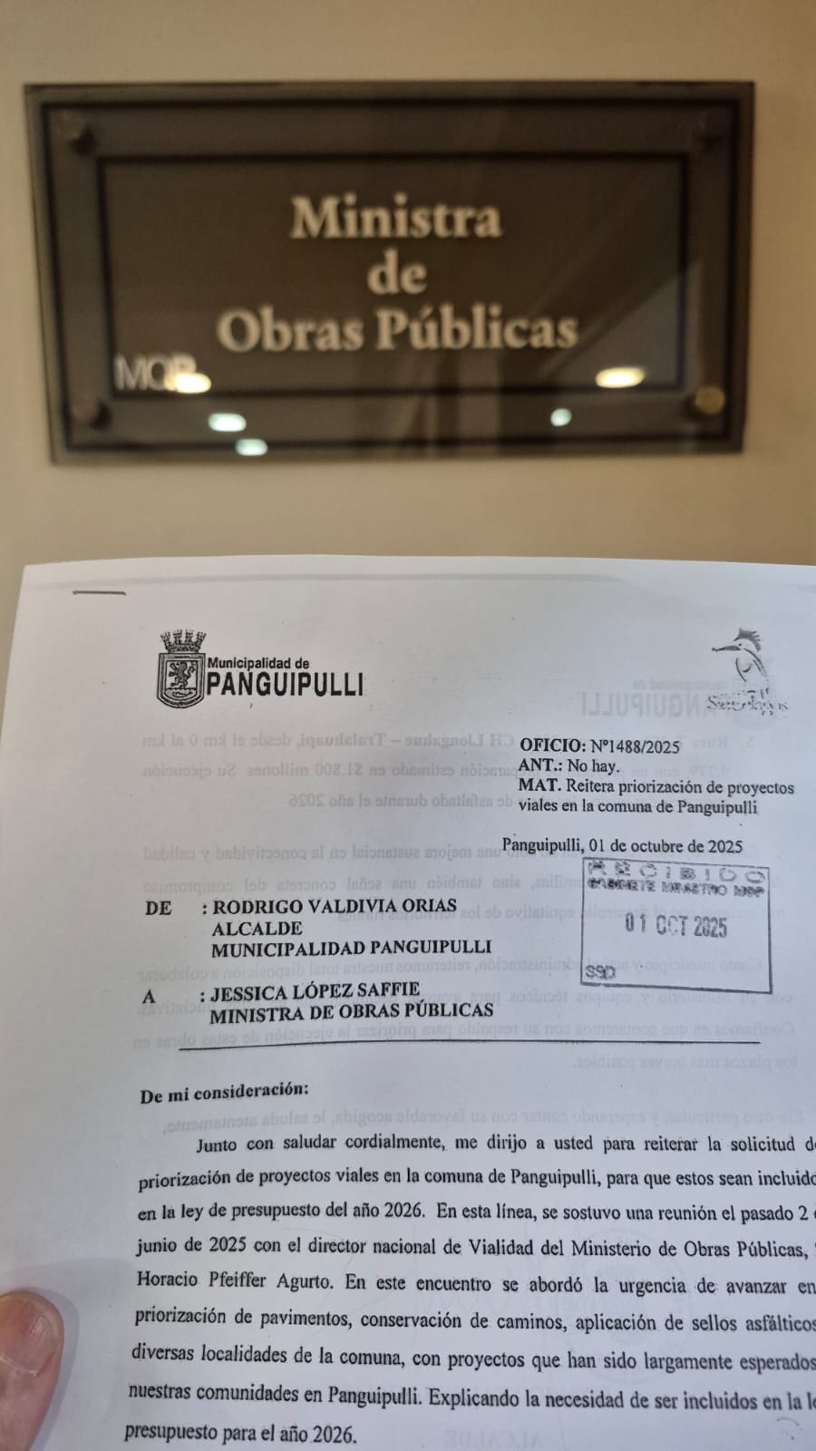 El alcalde de Panguipulli, Rodrigo Valdivia Orias, ingresó un oficio dirigido a Jessica López Saffie, Ministra de Obras Públicas, reiterando la solicitud de priorización de proyectos viales en la comuna para que sean incluidos en la Ley de Presupuesto 2026.
