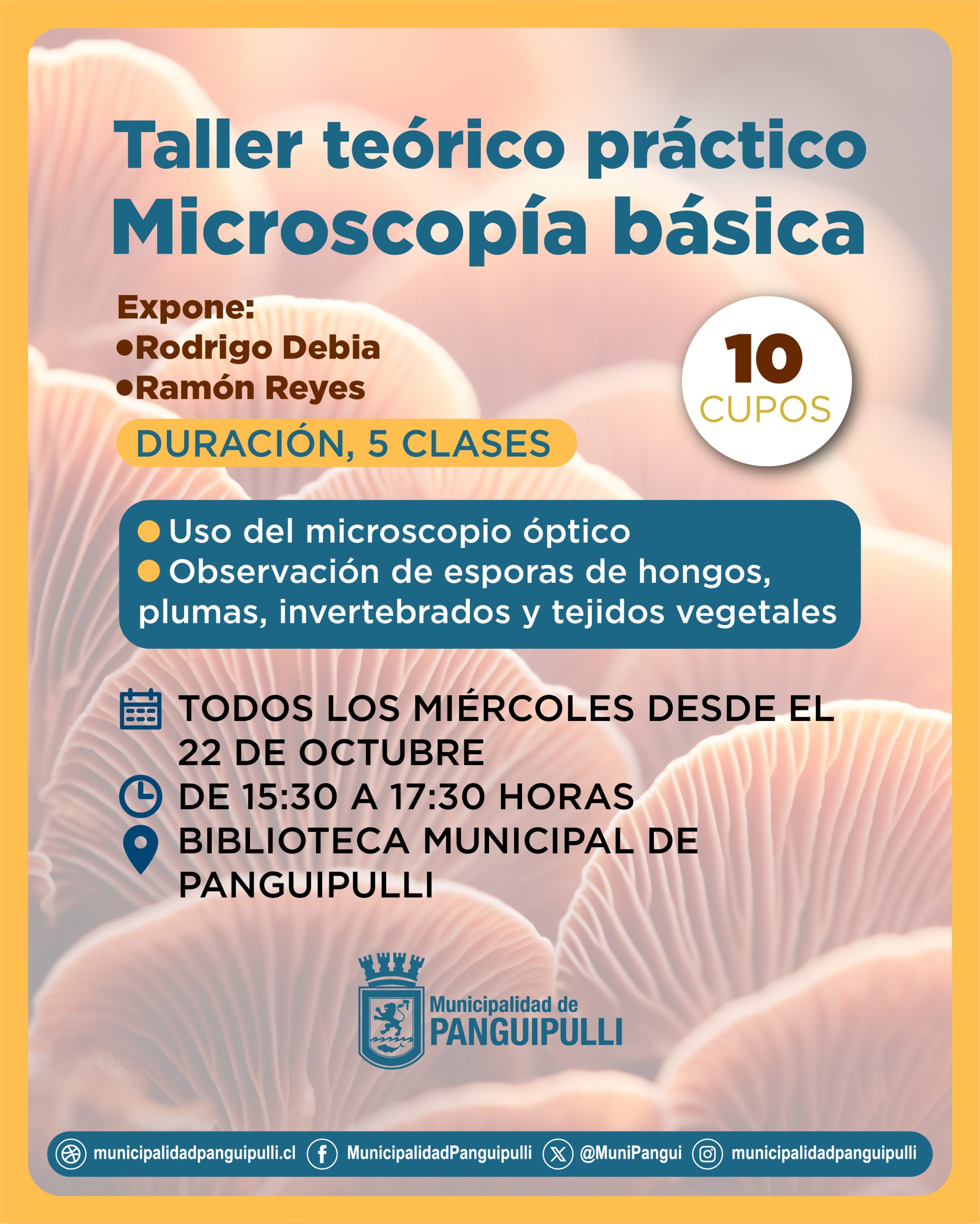 La Biblioteca Municipal de Panguipulli invita a toda la comunidad interesada en la ciencia y la naturaleza a participar del taller teórico-práctico de microscopía básica, una oportunidad única para explorar el fascinante mundo que no se ve a simple vista.