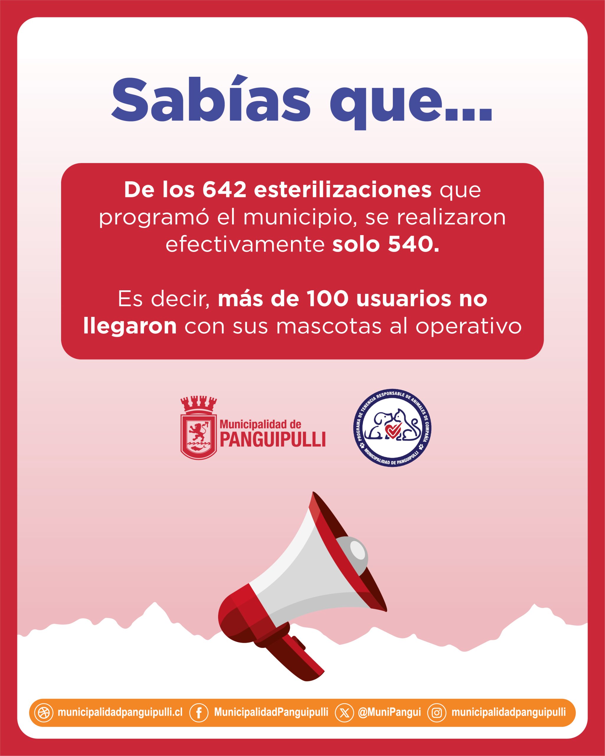 La Veterinaria Municipal de Panguipulli realizó recientemente una serie de operativos gratuitos de esterilización de mascotas en distintas localidades del territorio. Sin embargo, de las 642 intervenciones programadas, solo 540 pudieron concretarse, debido a que más de 100 personas no asistieron, pese a haber confirmado su inscripción previamente.