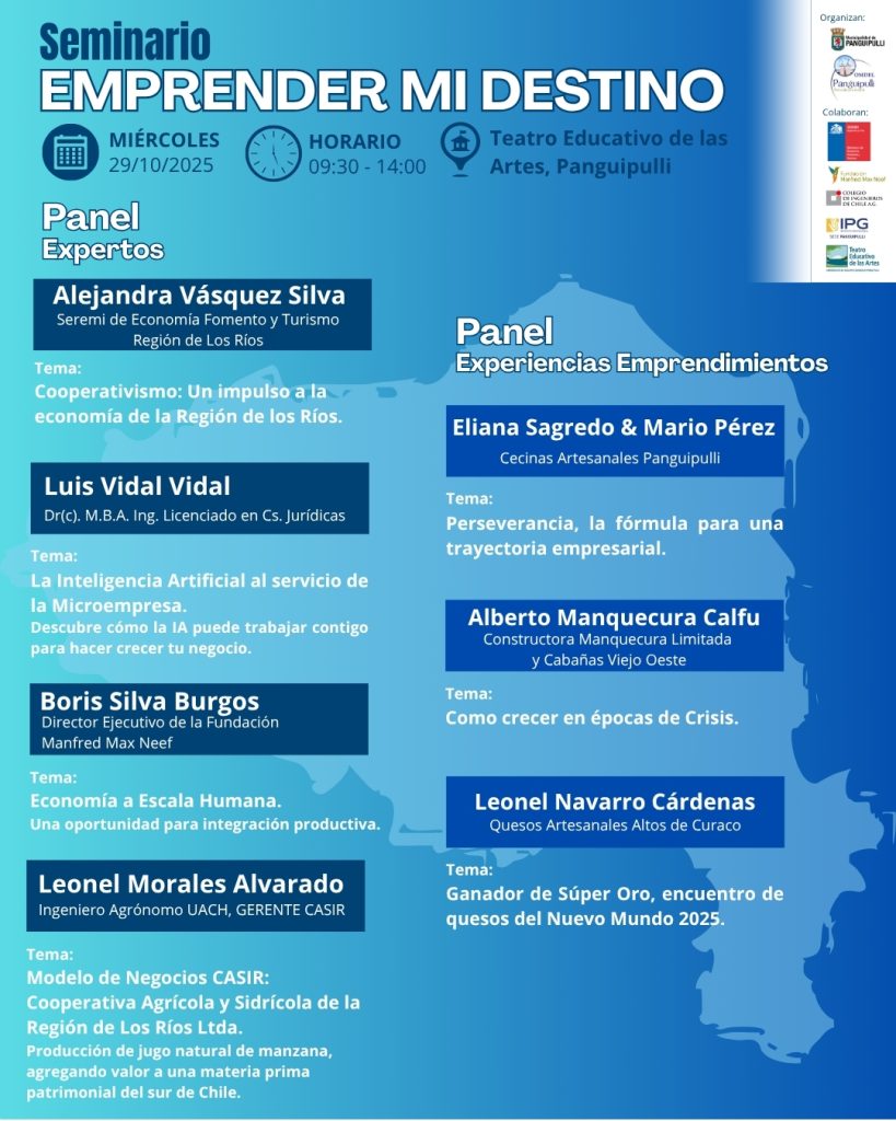 La Municipalidad de Panguipulli invita a toda la comunidad al seminario “Emprender mi destino”, una jornada gratuita que busca inspirar, capacitar y fortalecer el espíritu emprendedor de nuestra comuna. La cita es el próximo miércoles 29 de octubre, desde las 9:30 hasta las 14:00 horas, en el Teatro Educativo de las Artes de Panguipulli.