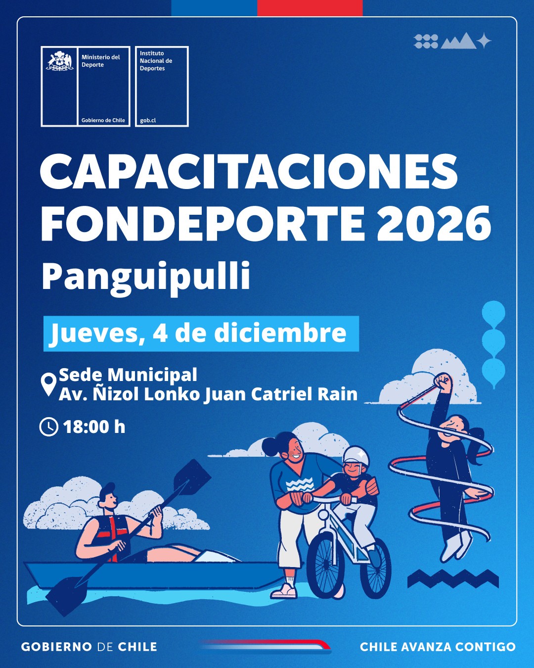 La Municipalidad de Panguipulli invita a todas las organizaciones deportivas, clubes, dirigentes y vecinos interesados a participar en la Capacitación Fondeporte 2026, una instancia clave para aprender a postular proyectos deportivos con financiamiento del Instituto Nacional de Deportes (IND).