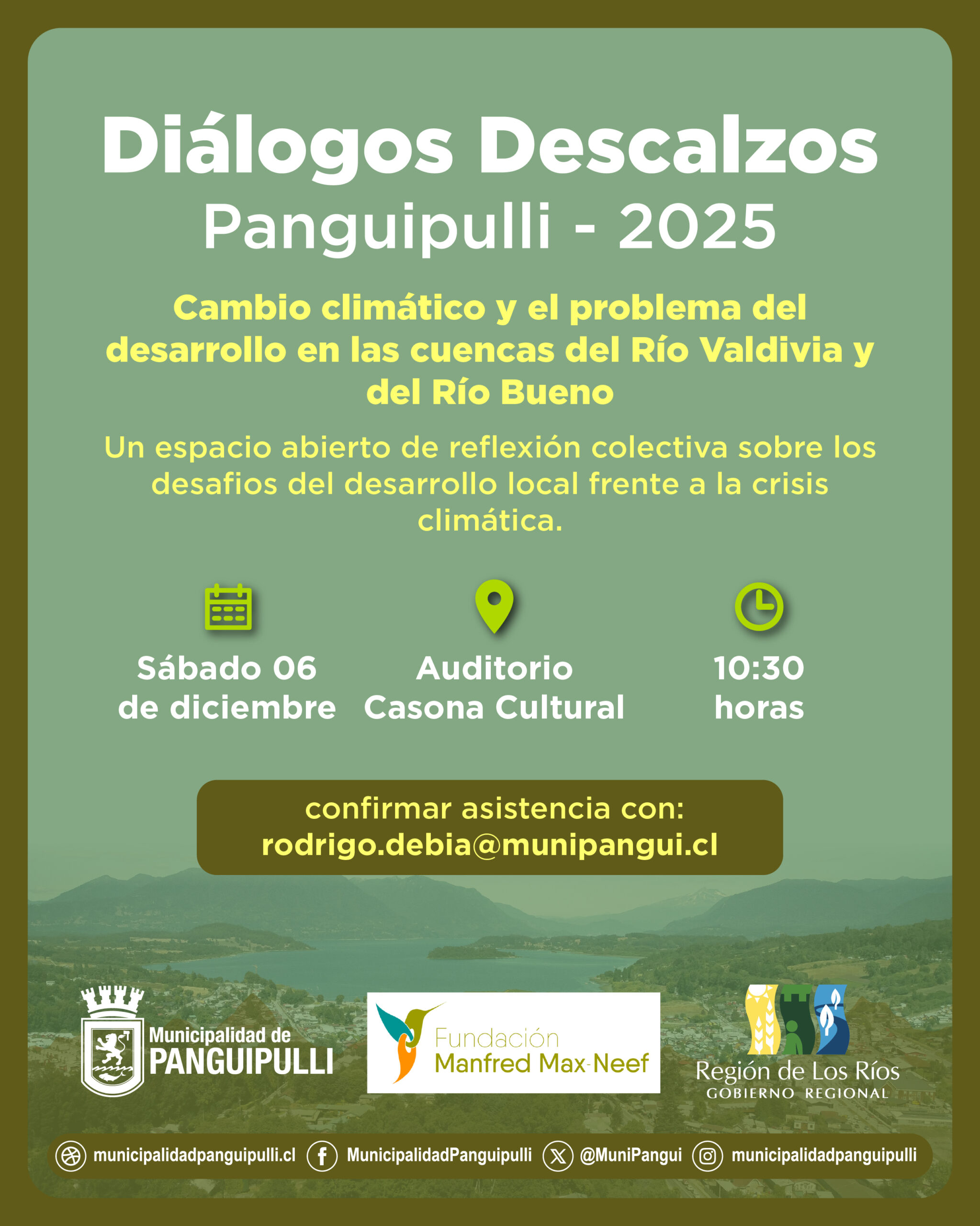 La Municipalidad de Panguipulli invita a la comunidad al encuentro “Diálogos Descalzos 2025: Cambio climático y el problema del desarrollo en las cuencas del Río Valdivia y del Río Bueno”, un espacio abierto de conversación, aprendizaje y reflexión sobre los desafíos que enfrenta nuestro territorio ante la crisis climática.