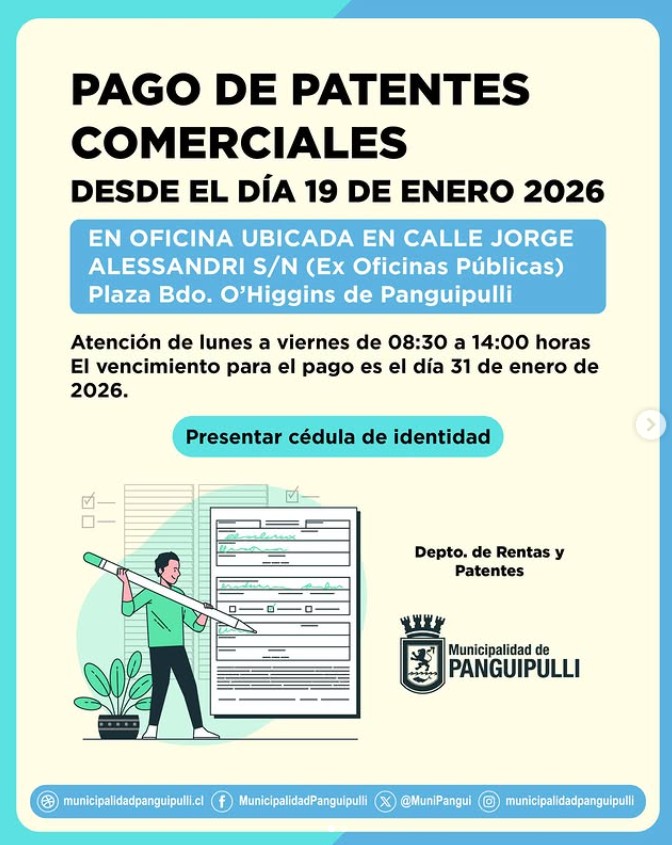 La Ilustre Municipalidad de Panguipulli informa a comerciantes, emprendedores y contribuyentes que el pago de patentes comerciales 2026 se encuentra habilitado desde el lunes 19 de enero, en la oficina municipal ubicada en calle Jorge Alessandri s/n (ex Oficinas Públicas), Plaza Bernardo O’Higgins, Panguipulli.