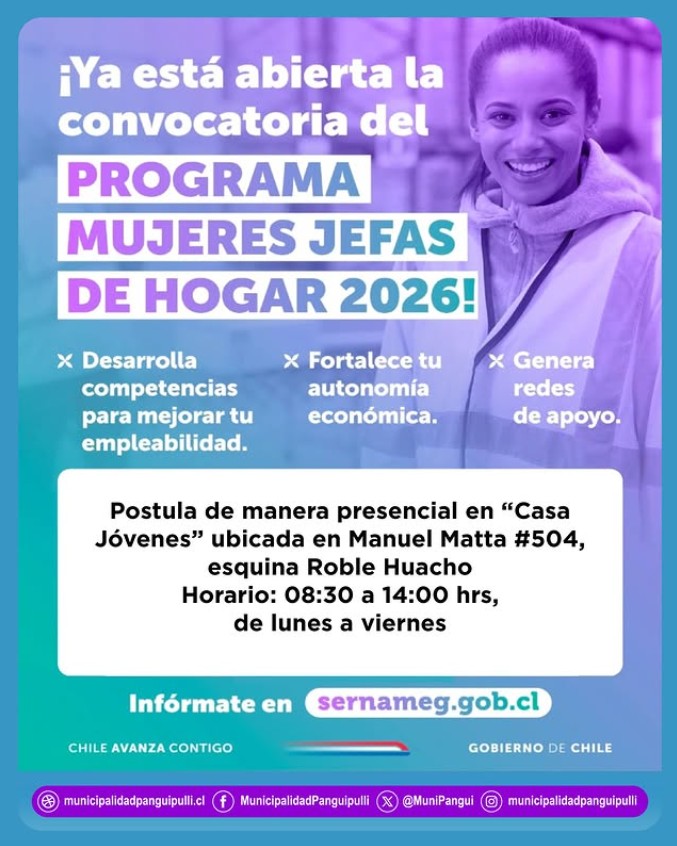 Postulación online: realiza tu postulación en https://www.sernameg.gob.cl/mujeres-jefas-de-hogar/ ingresando con tu clave única.