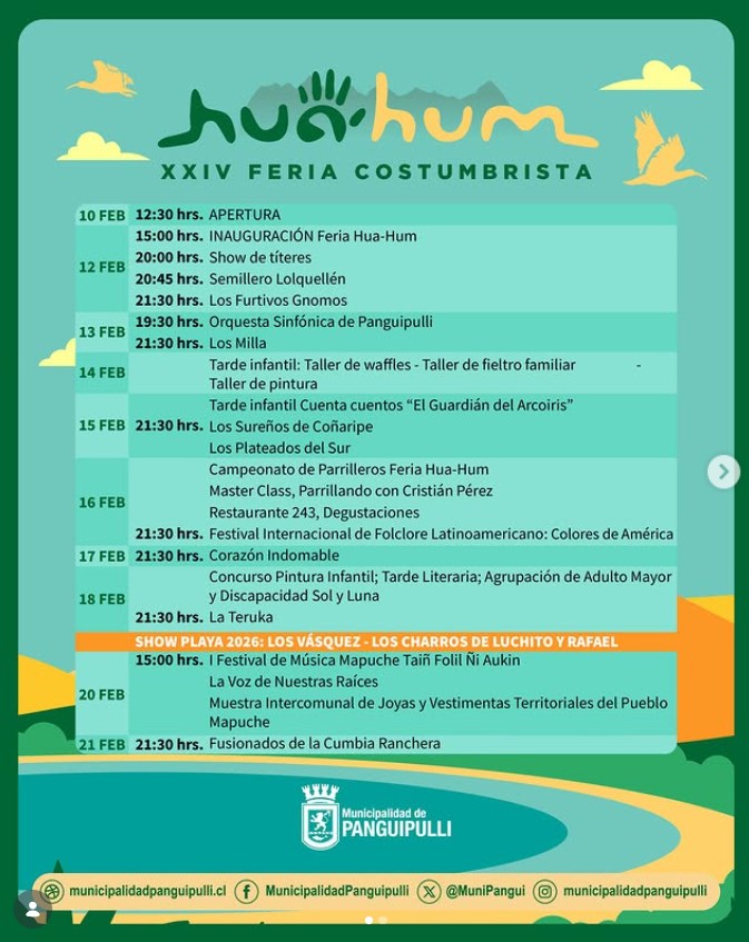 La Municipalidad de Panguipulli invita a vecinos, vecinas y visitantes a ser parte de esta gran celebración que rescata nuestras raíces, impulsa el emprendimiento local y fortalece la identidad cultural de la comuna. ¡La Feria Hua Hum los espera para vivir 11 días de fiesta, tradición y encuentro!