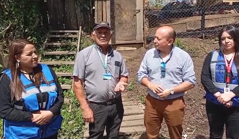 El alcalde Rodrigo Valdivia, junto al equipo del Departamento de Gestión del Riesgo y Desastres de la Municipalidad de Panguipulli, visitó al presidente del Comité de Adelanto Línea Férrea de Panguipulli Alto, tras la entrega de ayuda a una familia afectada por el incendio de su vivienda.