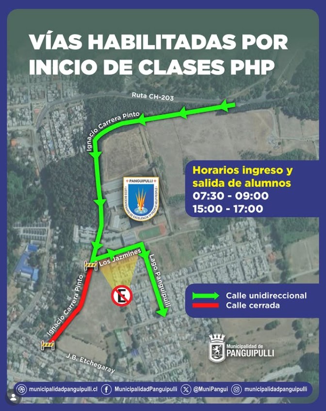Con el objetivo de resguardar la seguridad de estudiantes, apoderados, vecinas y vecinos, entre las 07:30 y 09:00 horas, y posteriormente entre las 15:00 y 17:00 horas, las calles Ignacio Carrera Pinto, Los Jazmines y Lago Panguipulli funcionarán en un solo sentido de circulación, medida que permitirá ordenar el flujo vehicular en horarios de alta congestión.