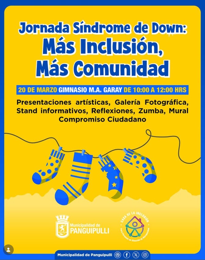 La Municipalidad de Panguipulli, a través de la Casa de la Inclusión, invita a toda la comunidad a participar en la «Jornada Síndrome de Down: más inclusión, más comunidad», una instancia orientada a promover el respeto, la diversidad y la inclusión en nuestra comuna.