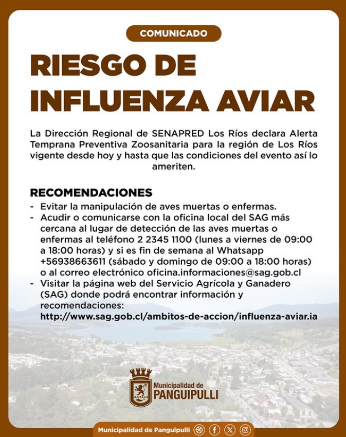 Desde la Municipalidad de Panguipulli se hace un llamado a la comunidad a mantener conductas responsables y preventivas, especialmente frente a la presencia de aves enfermas o muertas.