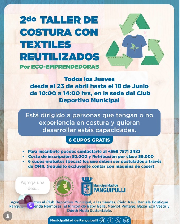 Agradecemos al Club Deportivo Municipal por facilitar el espacio para la realización de este taller. Asimismo, destacamos la colaboración de las siguientes tiendas que aportan material textil: Cielo Azul, Daniela Boutique Panguipulli, Tienda Hermosas, El Rincón de Baby Bella, Margot Vintage, Bazar Eco Vestir y Odeth Moda Sustentable.